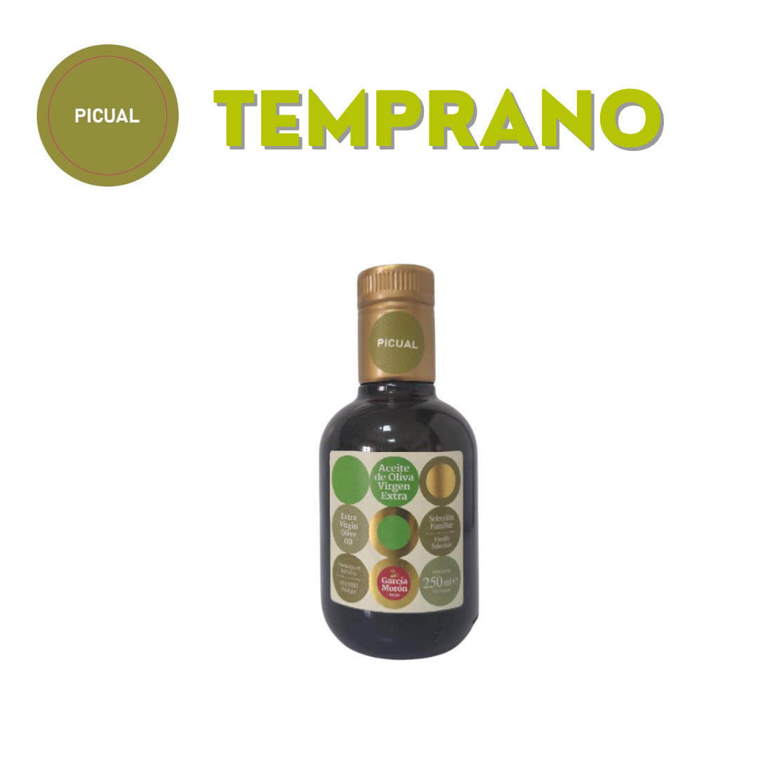 - Variedad Picual: Obtenido exclusivamente de aceitunas de la variedad Picual, caracterizado por su alta estabilidad, aroma frutado y notas de amargor y picante equilibradas.